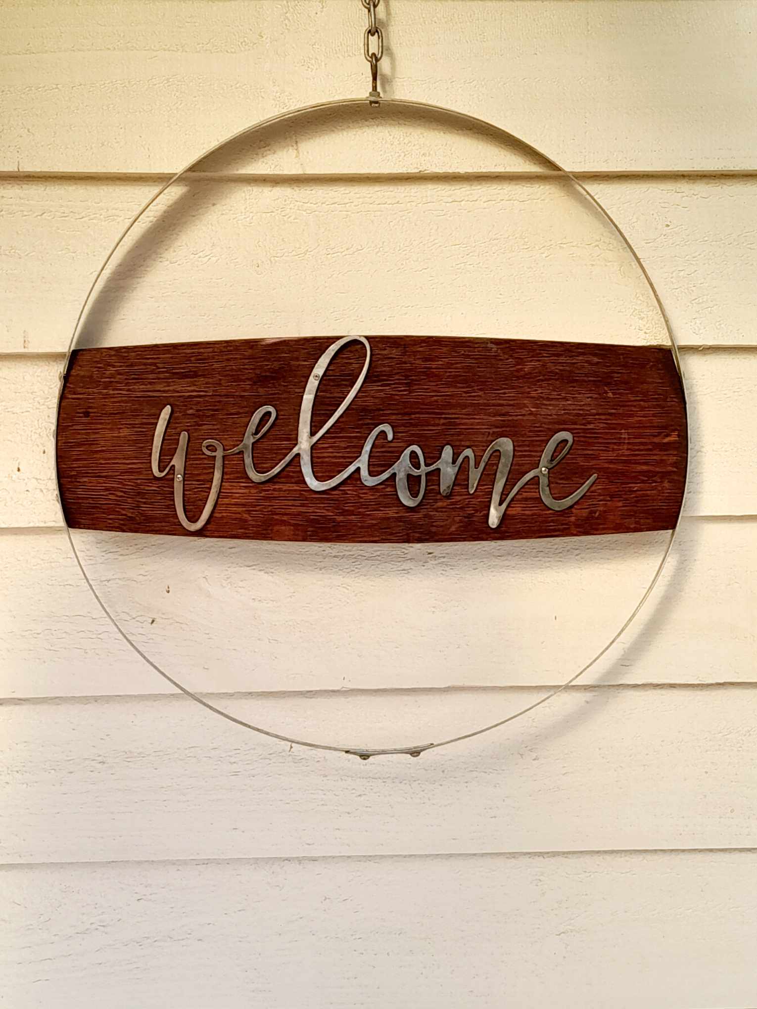 Made in our workshop made from a recycled wine barrel band and staves, burned and polyurethaned with 2mm stainless steel welcome word attached. Comes with a chain attachment to hang.